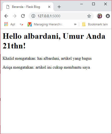 <html> <head> <title>{{ title }} - Flask Blog</title> </head> <body> <h1>Hello {{ orang.nama}}, Umur Anda {{ orang.umur }}!</h1> </body> </html>